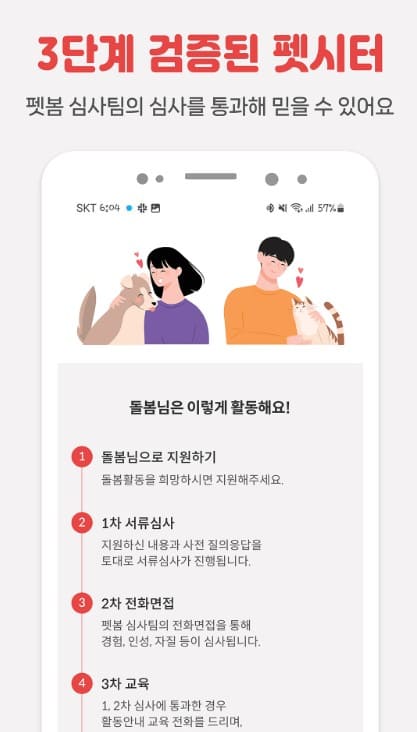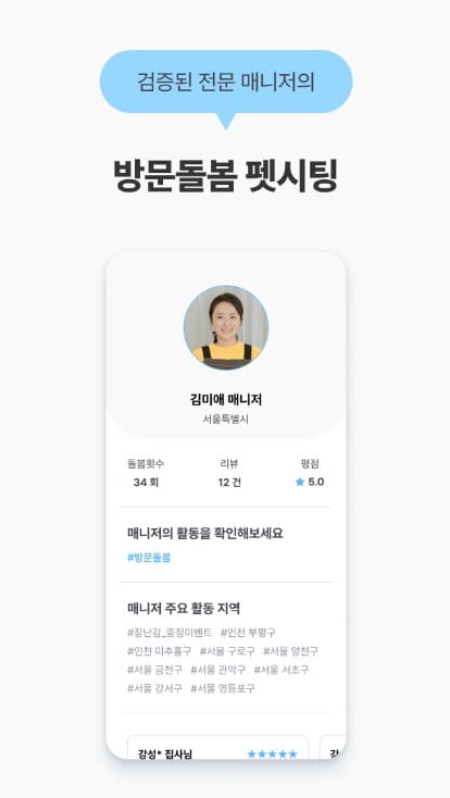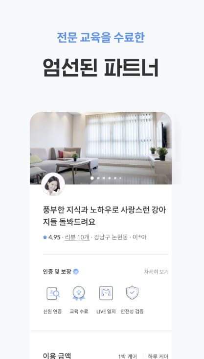 - 1. 엄격한 심사 과정을 거친 펫시터: 서류와 면접 등 총 3단계의 까다로운 검증을 완벽하게 통과한 돌봄님들만 활동하고 있어서 언제나 믿고 맡길 수 있는 안전한 환경을 제공합니다.