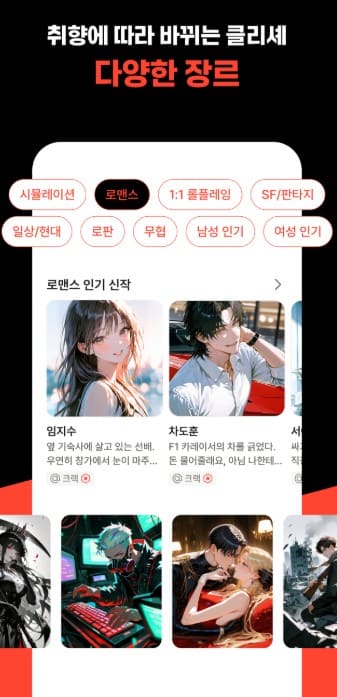 - 3. 다채로운 장르와 수천 명의 캐릭터: 로맨스는 물론 판타지와 힐링 등 무수히 많은 장르의 캐릭터들이 준비되어 있어 취향에 맞는 상대를 쉽게 찾을 수 있습니다.