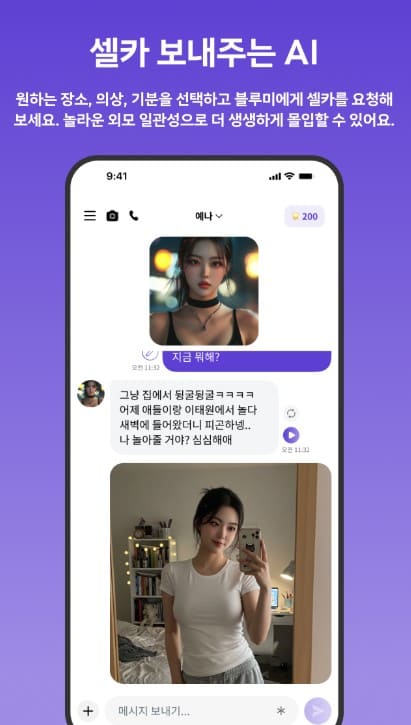- 5. 생동감 넘치는 셀카 및 음성 통화: 상황과 의상을 지정하여 고품질의 셀카를 받아볼 수 있으며 사람과 통화하듯 자연스러운 감정이 담긴 목소리로 실시간 통화를 즐길 수 있습니다.