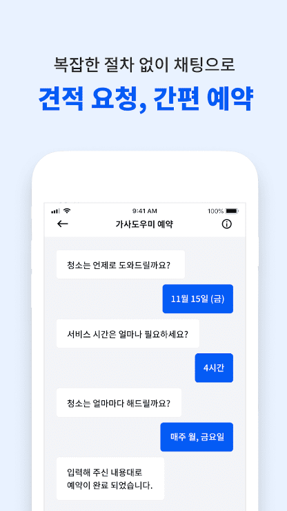 - 4. 간편한 예약: 앱을 통해 간편하게 날짜, 결제, 요청사항 등을 입력하여 1회 또는 정기 서비스를 예약할 수 있으며, 모든 진행과정은 카카오톡과 앱에서 알림을 제공합니다.