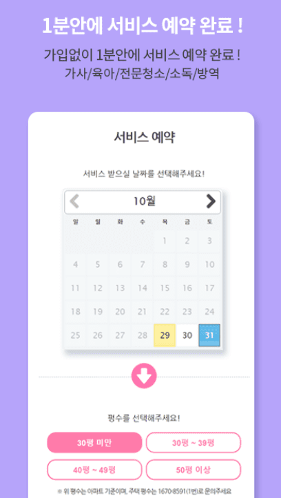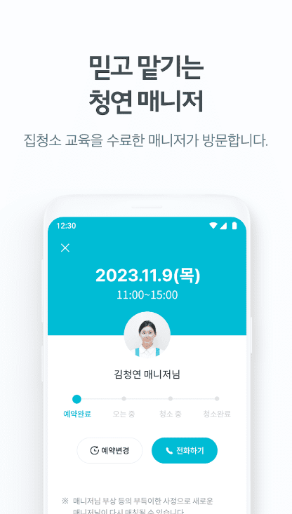- 2. 간편예약: 복잡한 예약 절차를 최소화하고, 날짜, 시간, 집 정보를 간편하게 입력하여 가까운 매니저와 신속하게 매칭이 가능합니다. 자동 취소 기능으로 편리한 예약 관리가 가능합니다.