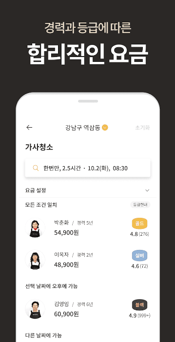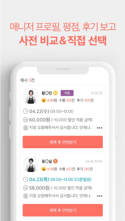 - 2. 매니저 선택 권한: 프로필과 평점/후기를 확인하고, 내가 원하는 매니저를 직접 선택하여 집 청소 전문가를 고를 수 있습니다.