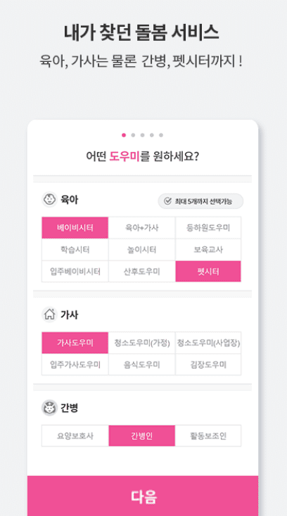 - 1. 다양한 돌봄 서비스: 육아, 가사, 간병, 펫시터 등 다양한 돌봄 서비스를 제공하며, 사용자는 필요한 서비스를 언제 어디서나 신청하고 이용할 수 있습니다.