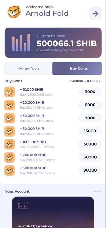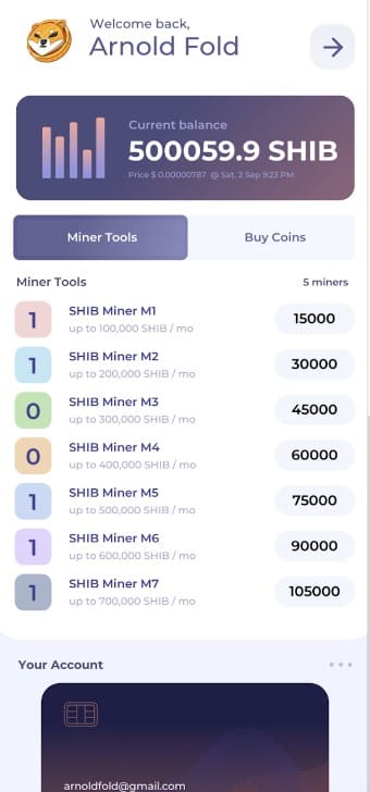- 1. 가상 채굴 도구: SHIB Miner by YDS는 물리적인 채굴 장비 없이도 SHIB 코인을 생성할 수 있는 가상 도구를 제공합니다. 사용자는 앱 내에서 마이닝 도구를 구매하고, 이를 통해 매초 코인을 생성할 수 있습니다.