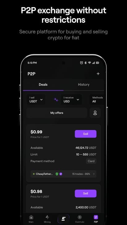 - 7. P2P 전송: P2P 전송을 통해 암호화폐를 빠르게 판매하고 구매할 수 있습니다.