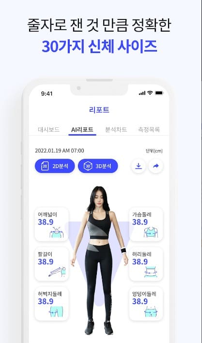 - 1. 신체 사이즈 측정: 스마트폰 카메라를 이용해 30가지 신체 사이즈를 측정할 수 있습니다. 등길이, 목둘레 등 세밀한 부분까지 정확히 측정하여 쇼핑과 운동에 도움을 줍니다.