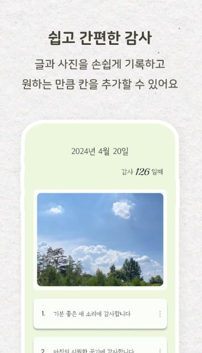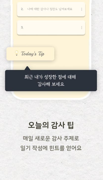 - 2. ‘오늘의 감사 주제’ 추천: 매일 새로운 감사 주제가 제공되어, 어떤 상황에서도 감사할 수 있는 기회를 제공합니다.