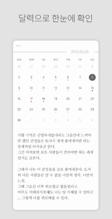 - 1. 감정 기록: 움직이는 감정 캐릭터로 기분을 기록하고, 달력에서 한눈에 기분 변화를 확인할 수 있습니다.