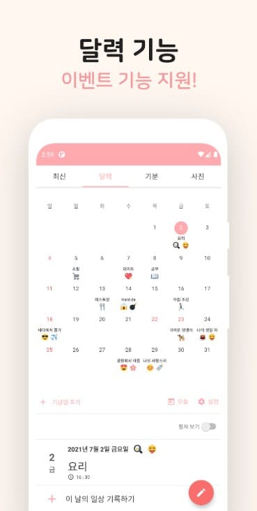 - 3. 사진 및 동영상 첨부: 사진, 동영상 등을 일기에 추가하여 시각적으로도 기억에 남는 일기를 작성할 수 있습니다.