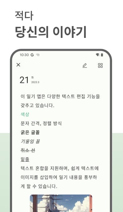 - 3. 강력한 텍스트 편집 기능: 줄 간격, 글자 간격, 색상, 글꼴 크기 등 다양한 텍스트 편집 기능을 제공하여, 개성 있는 일기 작성을 도와줍니다.