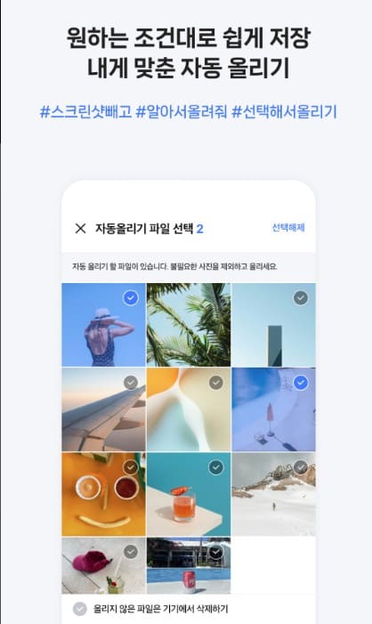 - 6. 편리한 조건 설정 자동 올리기: 와이파이에 연결될 때만 사진을 올리도록 설정하거나 특정 폴더의 사진만 자동으로 백업하는 등 사용자 환경에 맞는 다양한 조건을 설정할 수 있어 데이터 요금과 백업 관리가 매우 편리합니다.