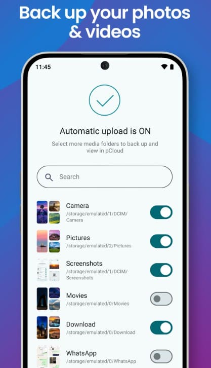 - 2. 원터치 자동 사진 및 동영상 백업: 단 한 번의 설정만으로 스마트폰에 있는 모든 사진과 동영상 파일을 알아서 클라우드로 백업해 줍니다. 이를 통해 휴대폰 저장 공간을 획기적으로 확보하고 데이터 유실 위험으로부터 완벽하게 대비할 수 있습니다.
