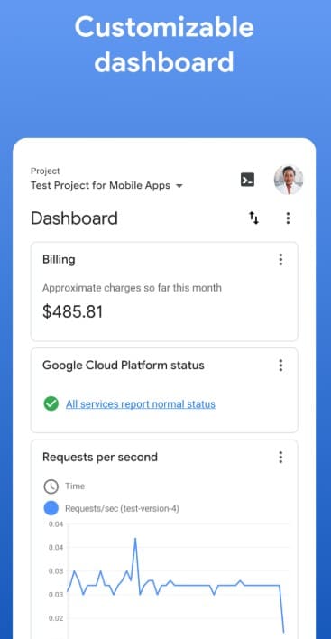 - 2. 실시간 리소스 모니터링 및 제어: Compute Engine의 가상 머신(VM)과 App Engine 서비스의 현재 상태 CPU 사용률 등을 실시간으로 모니터링할 수 있습니다. 또한 앱 내에서 직접 VM 인스턴스를 시작하거나 중지하는 등 즉각적인 제어가 가능합니다.